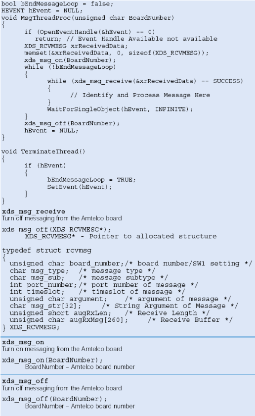 缺省情況下Amtelco卡不向應(yīng)用發(fā)送消息,應(yīng)用必須調(diào)用sdx_msg_on函數(shù)請求消息發(fā)送。當(dāng)用應(yīng)用停止后,需要sdx_msg_off函數(shù)停止發(fā)送消息。(注意:如果運(yùn)行多個(gè)應(yīng)用監(jiān)控板上消息,確信必須是最后一個(gè)應(yīng)用調(diào)用sdx_msg_off函數(shù))